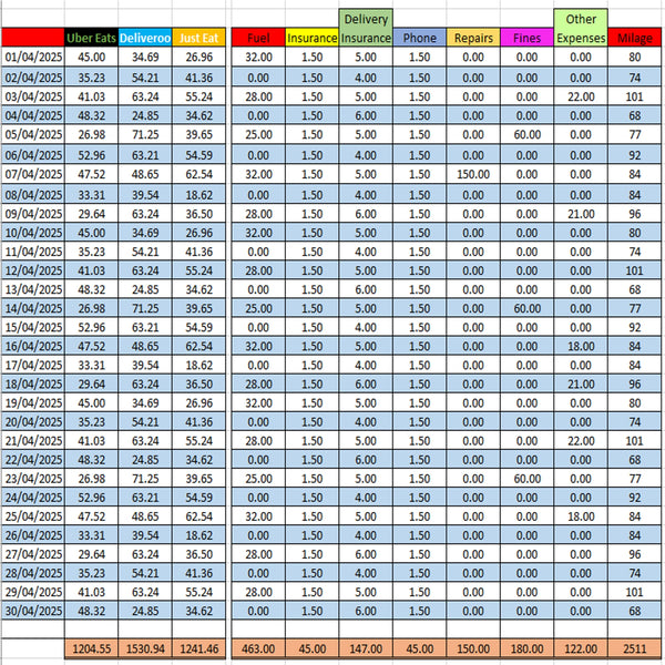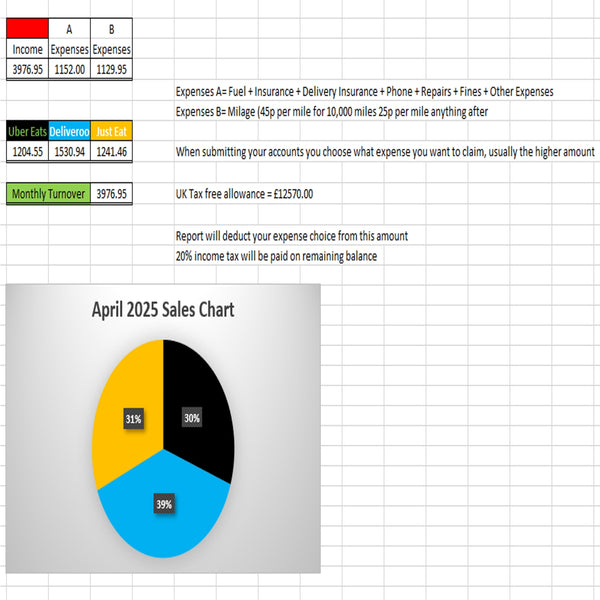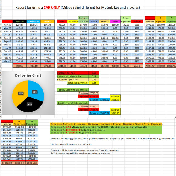 Deliveroo Uber Eats and Just Eat accounting spreadsheet software to enter all your Deliveroo Uber Eats and Just Eat sales. Easy to use spreadsheet sent digitally by email. Please provide email address when ordering this item.
